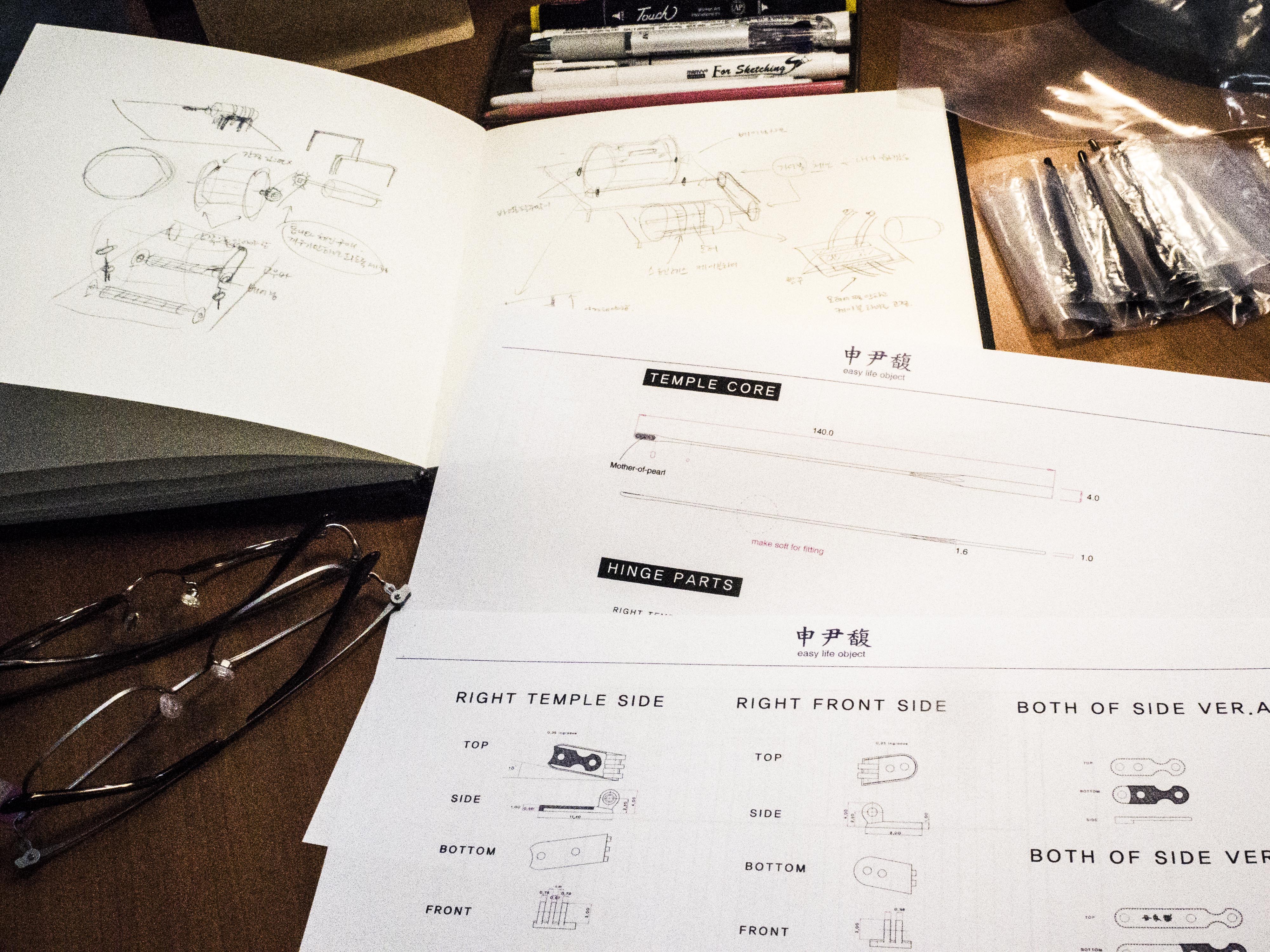 회사에 엉덩이 비비면서 월급 따먹기 할 생각 없는 기복이는 프리랜서가 됐고, 나도 마찬가지긴 하지만 좋아하는 안경판에서 일하니 업무 만족도가 아주 높다. 그러나 회사는 일과 상업적 이득을 만족시켜야 하기 때문에 여기서 나온 제품으로는 우리의 입맛까지 사로잡진 못한다. 회사 돈으로 자아실현할 생각은 없는데 나는 작업실에서 안경을 만들 수 있으니 갈증이 많이 해소된다. 아마 독자적인 형태와 부속을 만들어서 대중을 흔들 힘이 있는 회사에서 능력을 발휘한다면 더할나위 없겠으나, 국내 브랜드는 한 두 군데 빼고는 쉽지 않다. 일단 우리가 하는 프로젝트는 기복과 나, 두 업자의 입에 맞는다면 매니아들에겐 먹힐 거라 생각한다.이전 작업실과 공장 제품들은 미국이나 이태리, 중국에서 부속을 대량으로 구매하고 사용했기에 어느 정도 비슷비슷하고 표준화 되어있다. 대신 구하기도 쉽고 직접 만드는 것보다는 상대적으로 저렴했다. 지금 뚝섬에 이사 오고 아무래도 작업실에 temple metal core를 shooting 할 장비는 들여두기가 쉽지 않기 때문에 여러 가지 다른 방도를 생각해보았다.