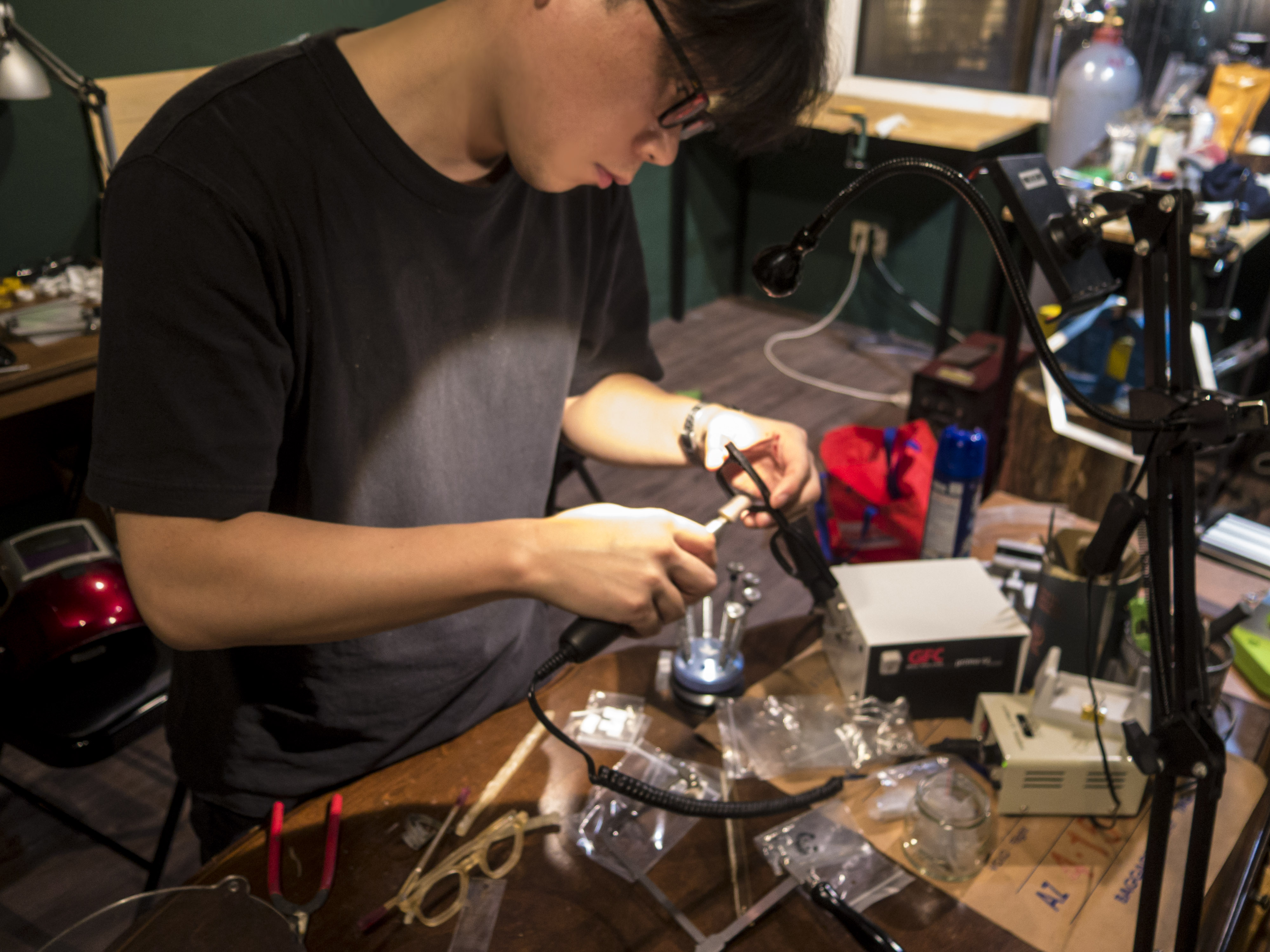 세계의 작은 공방에서 만드는 수제안경은 기존의 공장에서 나왔던 부속들을 사용하되 아세테이트는 형태를 마음대로 깎고 다듬고 광내는 분위기였다. 모두들 기본적인 공정과 연마와 광을 내고 피팅을 해서 한동안 써보고 난 후에 만들면 만들수록 드는 디테일들에 신경 쓰기 시작한다. 열 힌지를 삽입하고 얼마나 깨끗하게 마무리가 되는가, 리벳을 달았는데 좌우가 완벽한가, 다리를 접었을 때 얼마나 일치하는가, 엔드피스 쪽 다리와 프론트의 닿는 면이 완벽한가, 아세테이트 안에 기포는 없는가 등등 만들어 본 사람들만 굉장히 신경 쓰는 그런 부분들 (디테일) 때문에 시간은 두배 정도가 길어졌고 그런 것 때문에 처음부터 다시 만드는 경우도 많다.